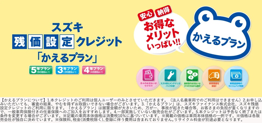 安心 納得 お得なメリットいっぱい!「かえるプラン」は車両本体価格(税抜)の一部をあらかじめ残価として設定し、残りの金額を分割してお支払いいただくクレジットです。今なら実質年率3.9%実施中。